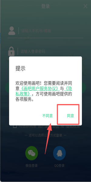 1、阅读协议点击“同意”,授权后即可使用微信、QQ或手机登录画吧。