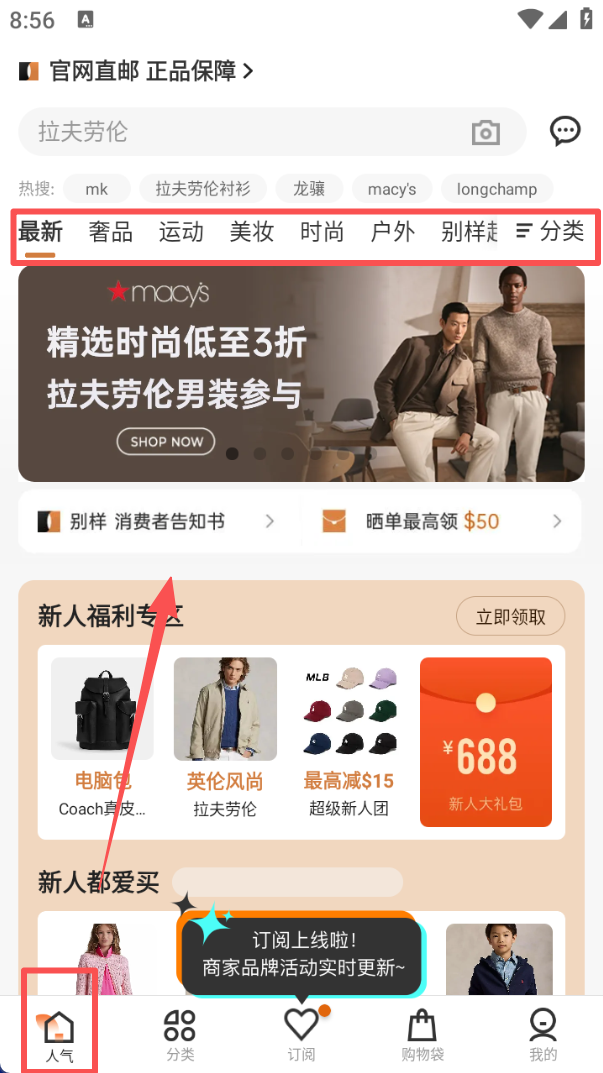 1、进入软件后,先点击底部 “人气” 板块,在页面上方能看到最新、奢品等分类标签,还可浏览新人福利专区内容。
