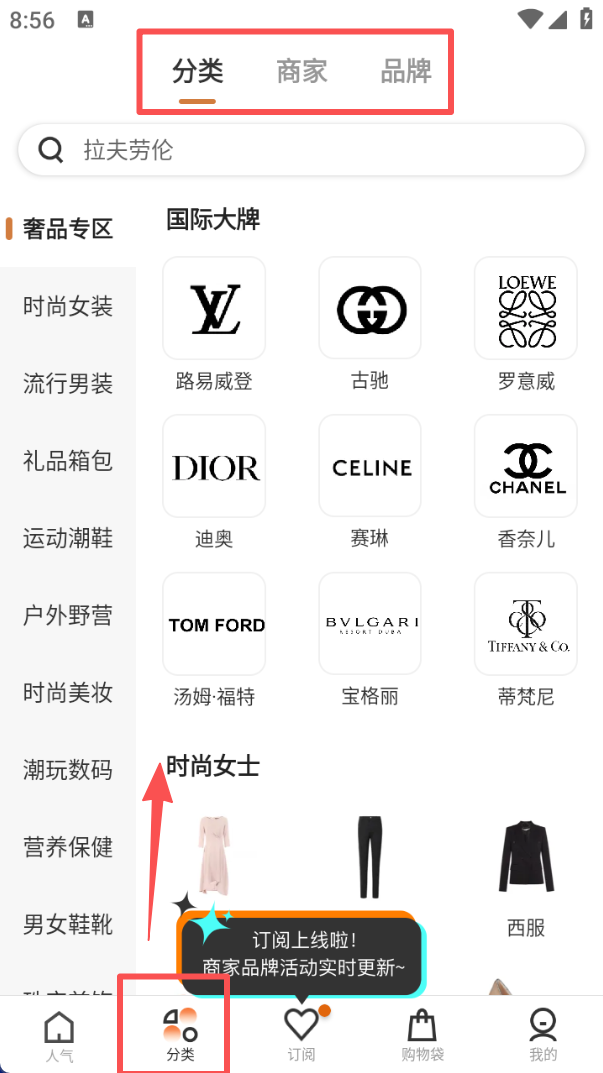 2、切换至 “分类” 界面,顶部有分类、商家、品牌选项,左侧列表可选择时尚女装等品类,查看对应商品。