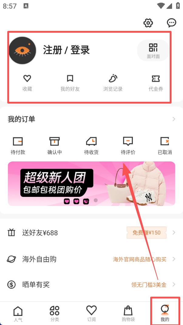 4、进入 “我的” 页面,可找到注册 / 登录入口,同时能查看我的订单、收藏等个人相关功能及信息。