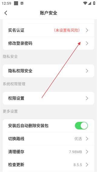 3、在账户安全页面,点击【修改登录密码】选项,进入修改登录密码界面。