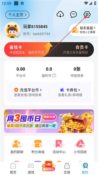 1、在游戏平台首页,点击右下角【我的】,进入个人界面。