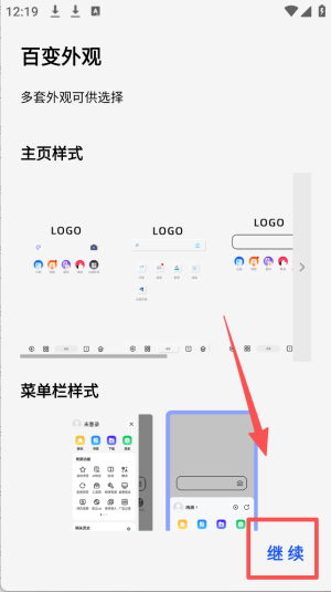 4、在外观设置页面,选择您喜欢的主页样式和菜单栏样式后点击“继续”。