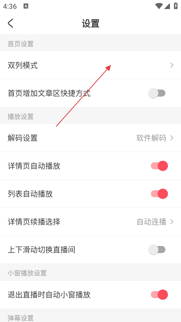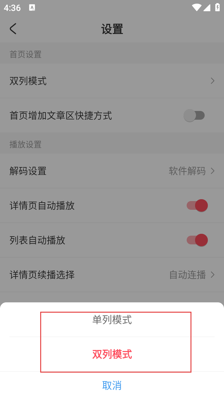 3、在设置界面,若要调整页面显示模式,点击【双列模式】选项,进入模式选择弹窗。