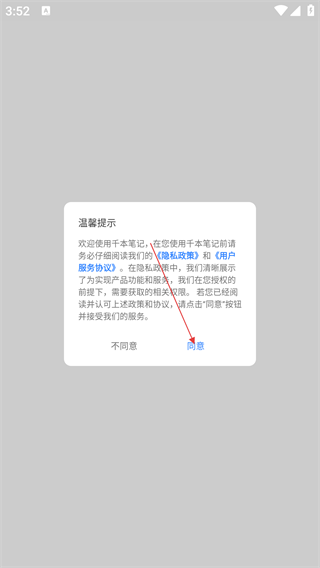 1、打开【千本笔记】,阅读《隐私政策》和《用户服务协议》后,点击【同意】进入应用。