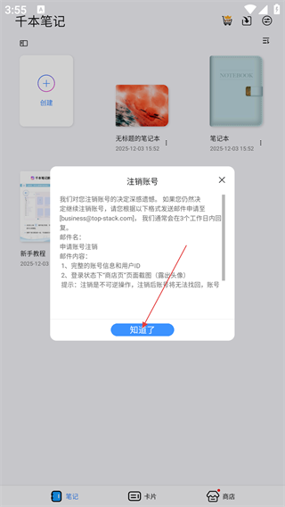 4、若确认注销,需按要求向指定邮箱发送包含账号信息、截图的申请;点击【知道了】关闭弹窗,完成流程查看。