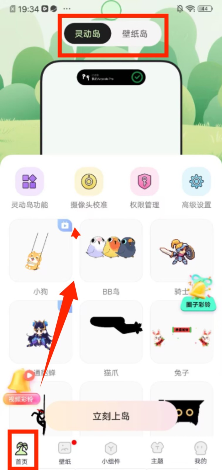 1、进入首页,切换 “灵动岛”“壁纸岛” 分类,选择小狗、BB 鸟等样式,点击 “立刻上岛” 应用效果。