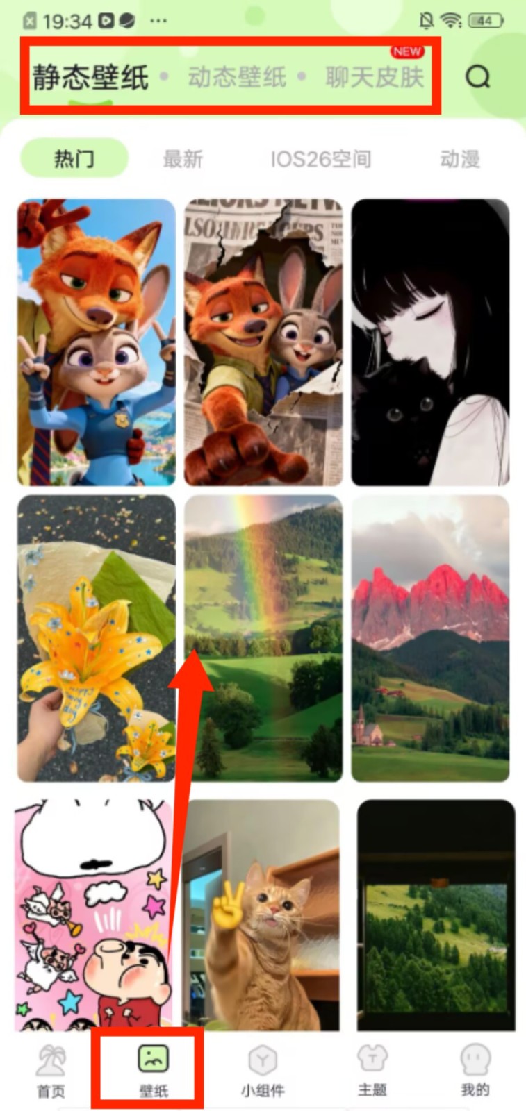 2、切换到壁纸页面,在静态、动态壁纸分类下,挑选热门风格的壁纸资源,完成界面美化设置。