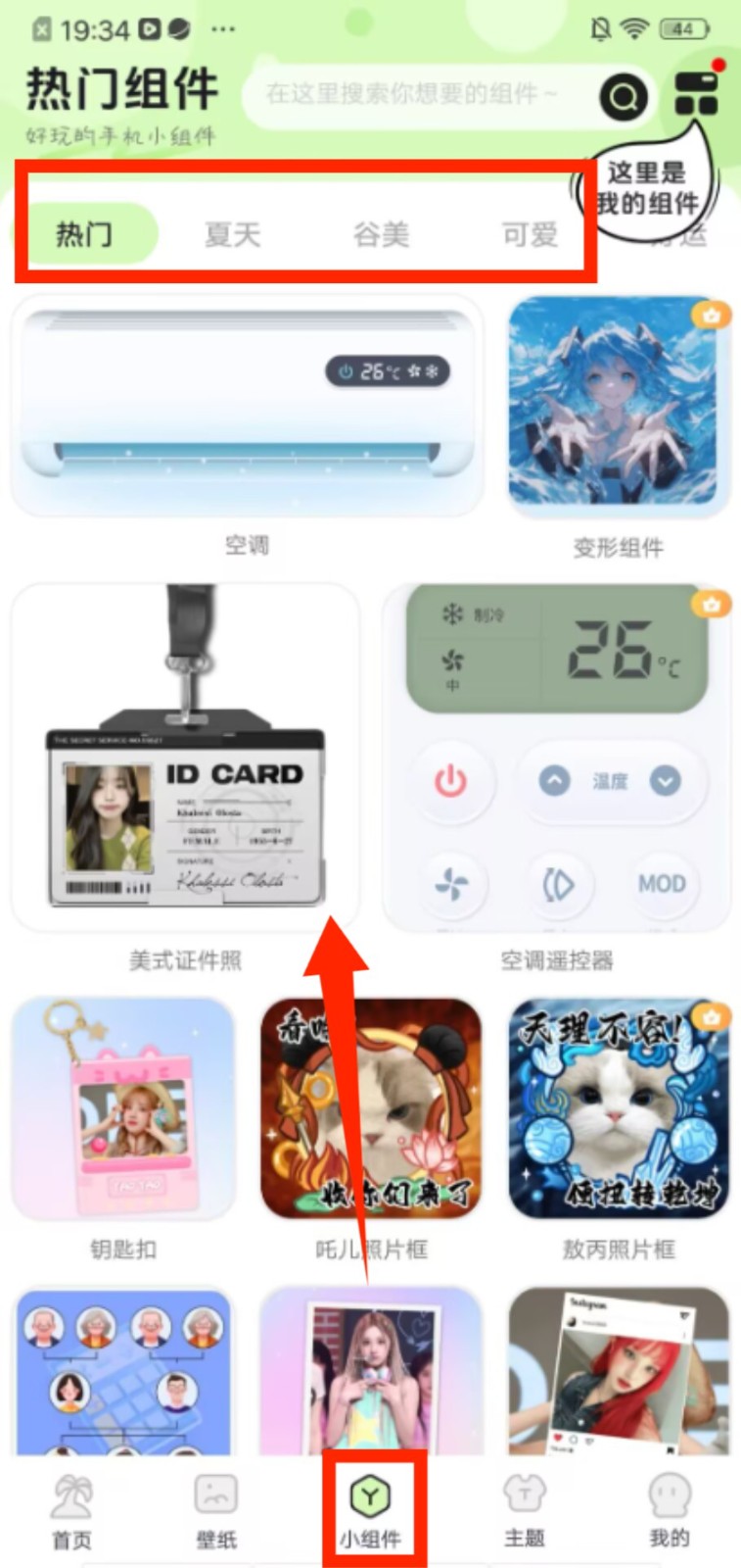 3、打开小组件页面,在热门分类里选择空调、证件照等组件样式,添加到桌面丰富功能展示。