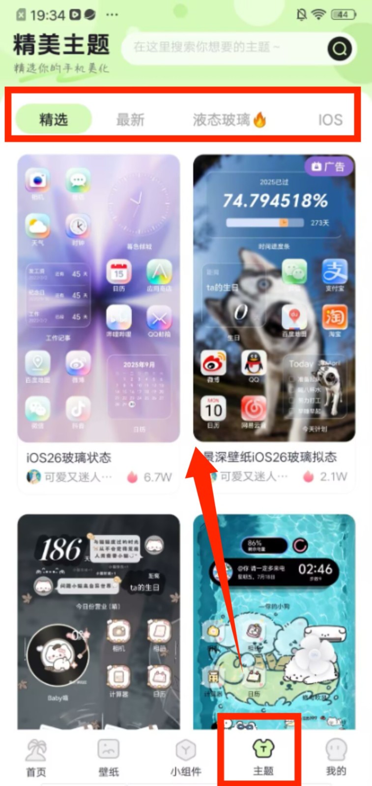 4、进入主题页面,在精选分类下选择 iOS26 玻璃状态等主题,一键应用以美化手机整体界面。