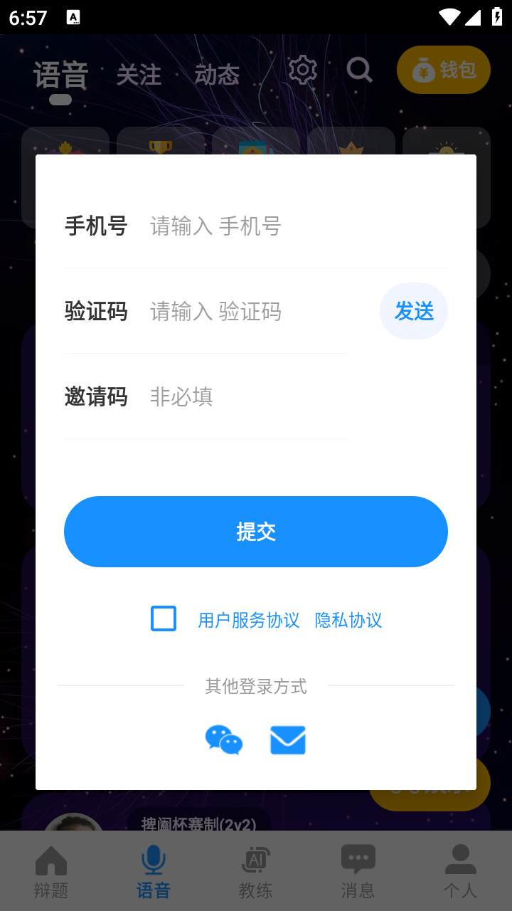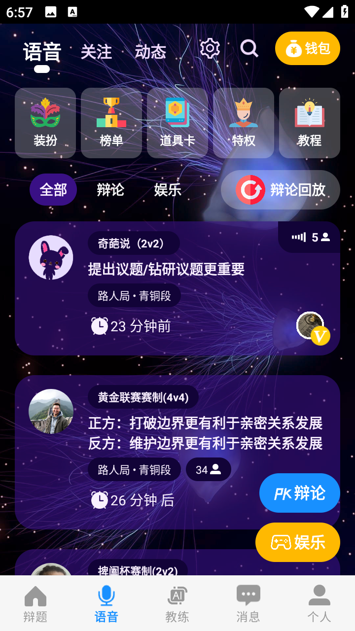 1、进入软件主界面,可看到【语音】【关注】等板块,还有【奇葩说-(2v2)】等辩论相关内容,先熟悉界面布局。