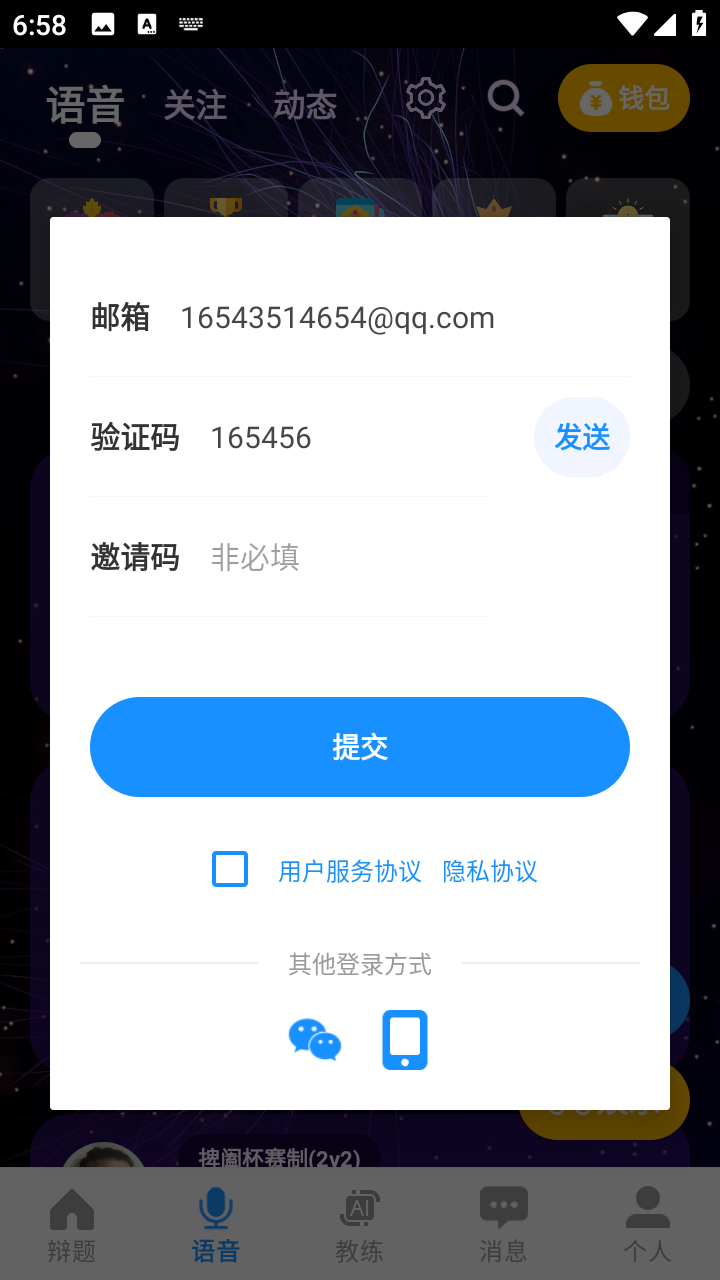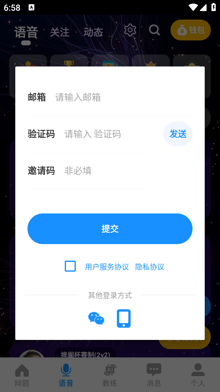 3、若选择邮箱登录,在登录窗口中,依次输入邮箱、验证码,邀请码非必填,准备登录。