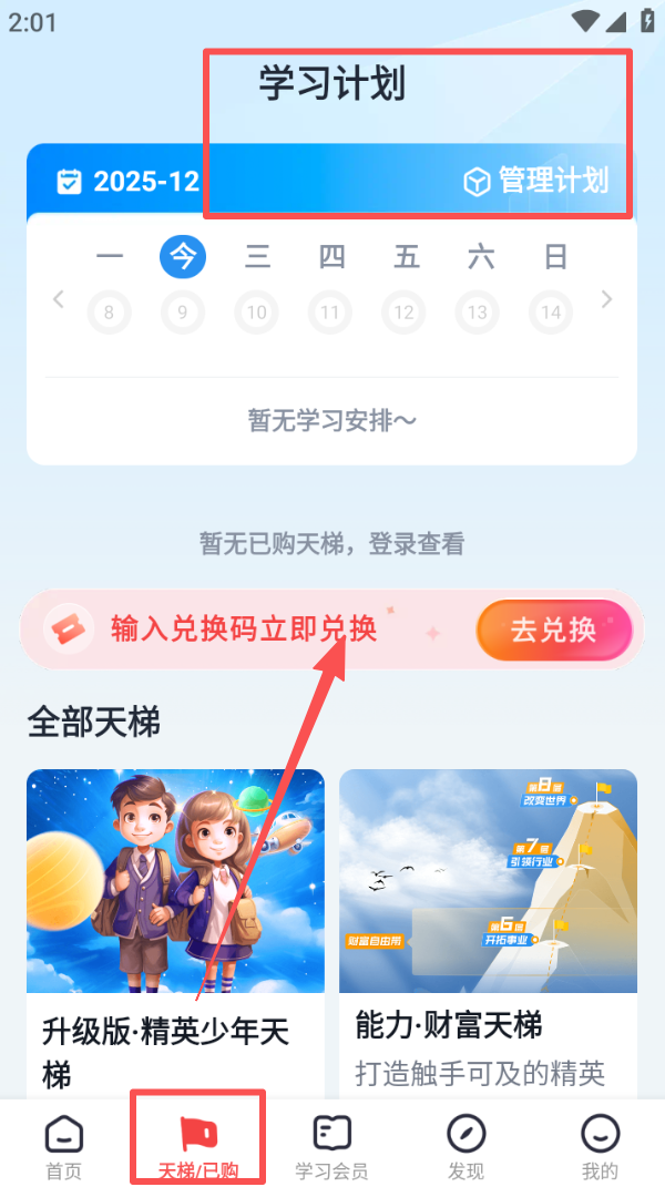 2、切换到天梯 / 已购页面,在学习计划板块点击 “管理计划”,可规划自身的学习安排与进度。