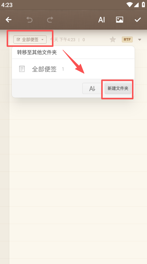 2、打开全部便签的下拉菜单,选择 “新建文件夹”,创建分类文件夹用于整理便签内容。