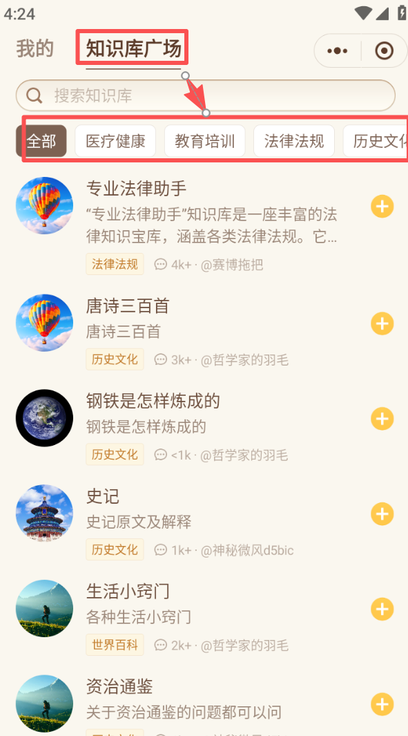 3、切换到知识库广场,在医疗健康、教育培训等分类下,选择心仪的知识库点击添加。