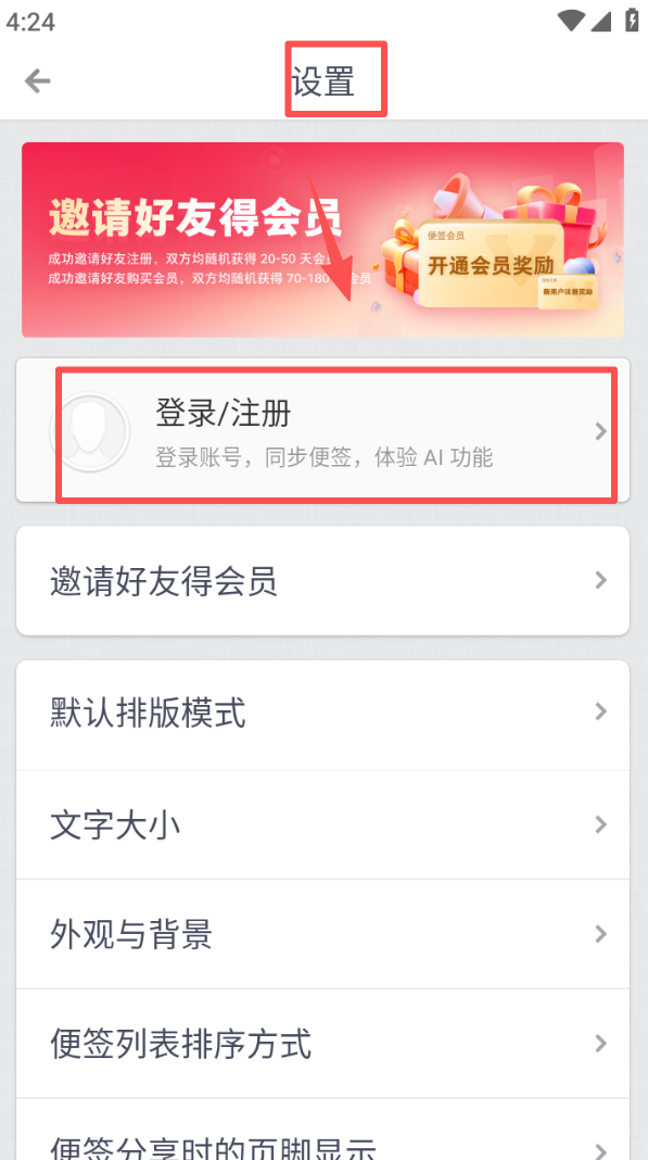 4、进入设置页面,点击 “登录 / 注册” 完成账号验证,可同步便签并体验 AI 相关功能。