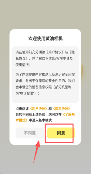 1、打开黄油相机,仔细阅读协议后点击“同意”授权设备信息进入主界面。