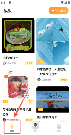 2、在模板广场滑动挑选心仪模板,轻点“使用”立即进入图片导入页面。
