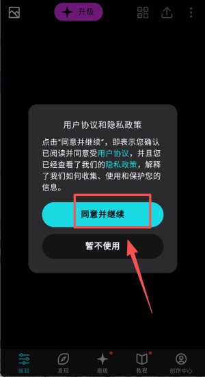1、打开泼辣修图阅读用户协议后点击同意并继续进入主界面。