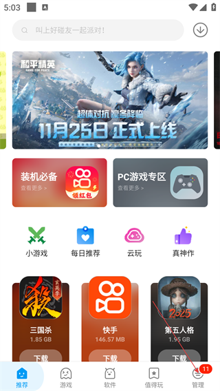 1、在应用推荐页可浏览游戏、软件资源,点击底部【管理】进入个人管理界面,可进行应用更新、清理等操作。