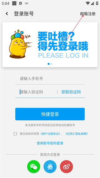 3、在登录账号界面,除手机号快捷登录外,可点击“邮箱注册”选项,切换至邮箱注册的操作界面。