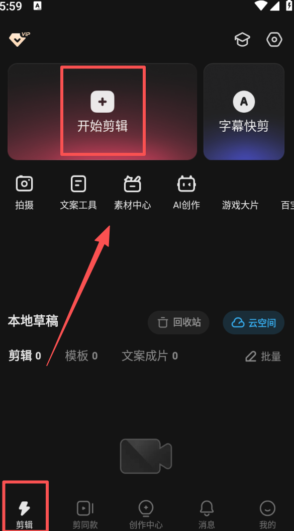 1、在软件底部点击 “剪辑” 选项,进入后找到 “素材中心”,可从中挑选各类创作素材。