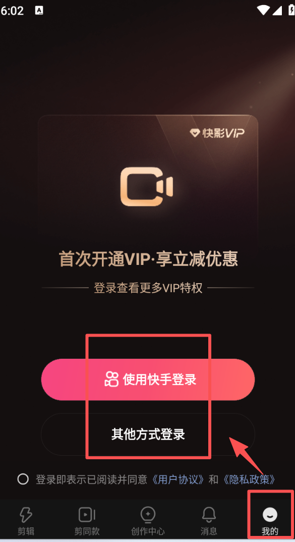 4、点击 “我的”,可选择 “使用快手登录” 或 “其他方式登录”,登录后可查看快影 VIP 特权。