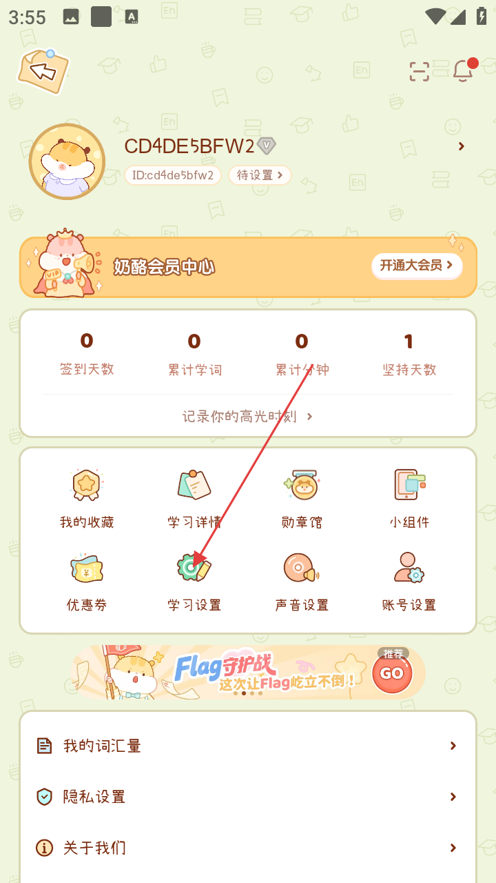 2、在APP底部点击【我的】进入个人页面,可查看历史学习记录,也能找到【学习设置】入口,自定义学习相关选项。