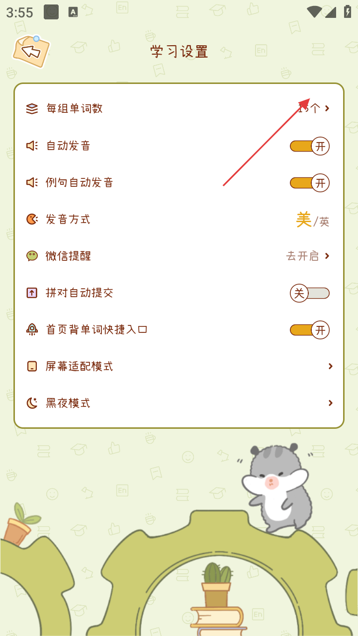 3、进入【学习设置】页面,可设置【每组单词数】,勾选或取消【自动发音】功能,调整符合自身习惯的学习模式。