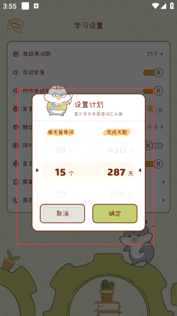 4、点击设置背单词计划的弹窗,选择每天要背的单词数量,查看对应的完成天数,确定后即可按计划开展背单词任务。