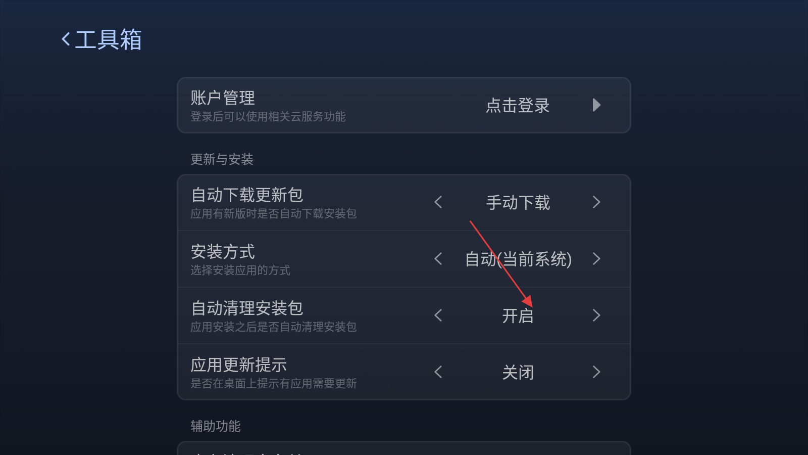 3、在设置页面找到【自动清理安装包】选项,点击该选项。