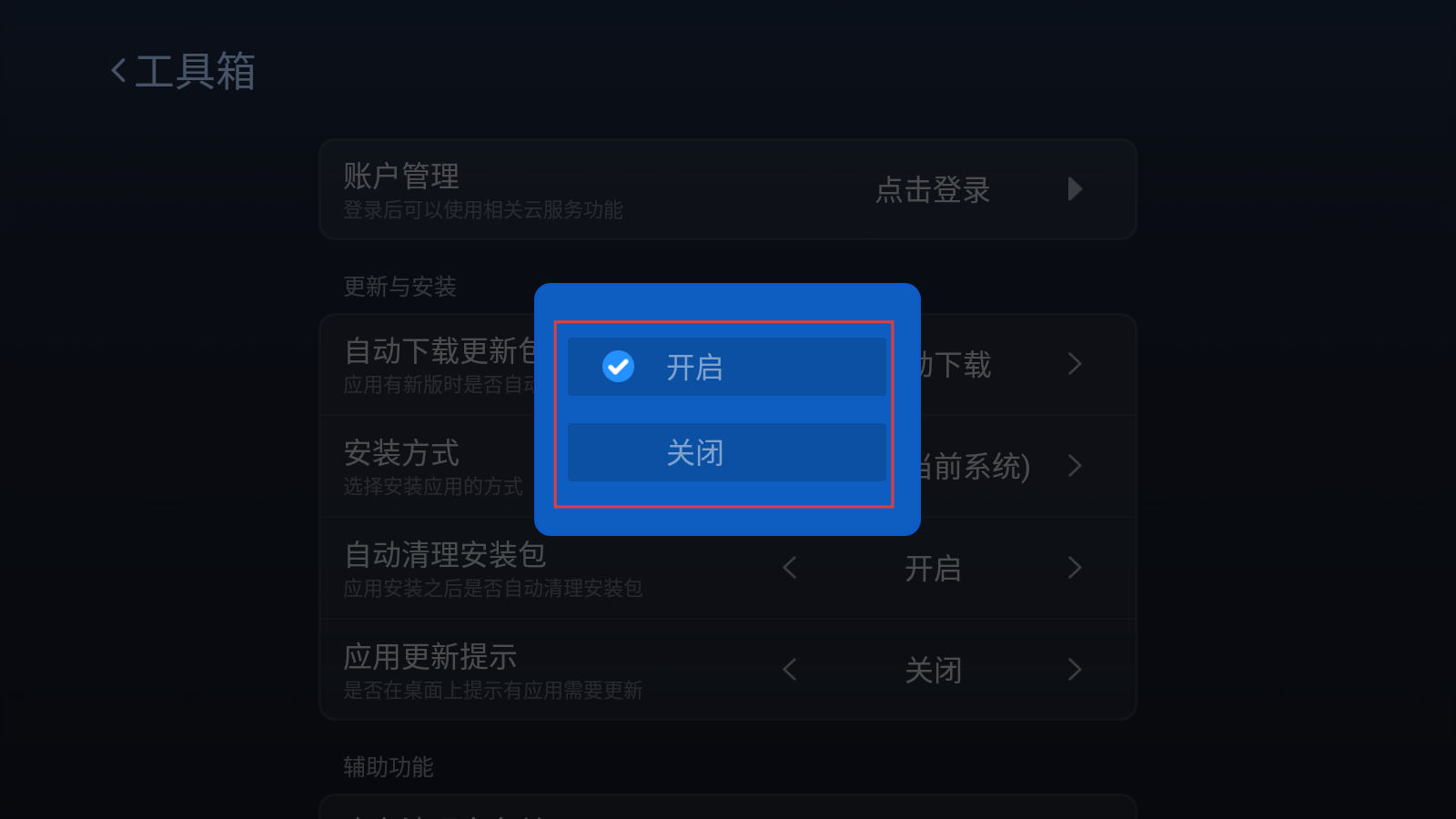 4、在弹出的选项中选择【开启】,应用安装之后将自动清理安装包,节省设备存储空间。