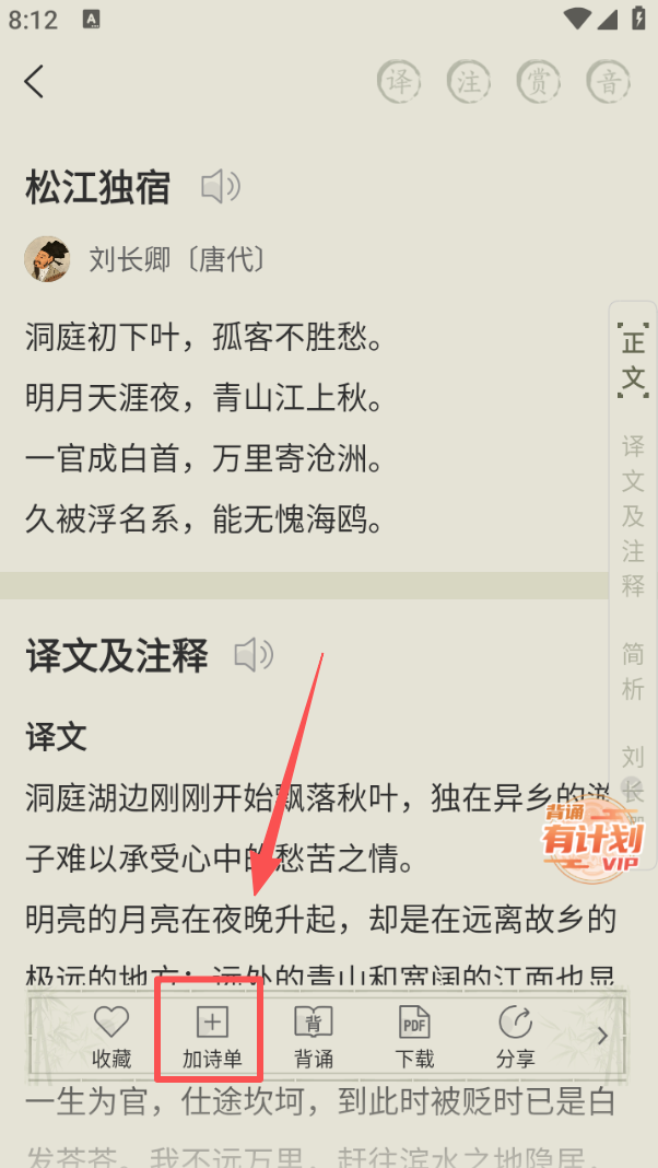2、进入诗文详情页,点击 “加诗单”,可将该诗文加入诗单以便整理。