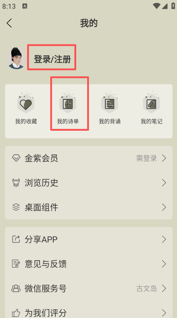 3、点击个人页面的 “登录 / 注册”,登录后可查看 “我的诗单”,管理收藏的诗文。