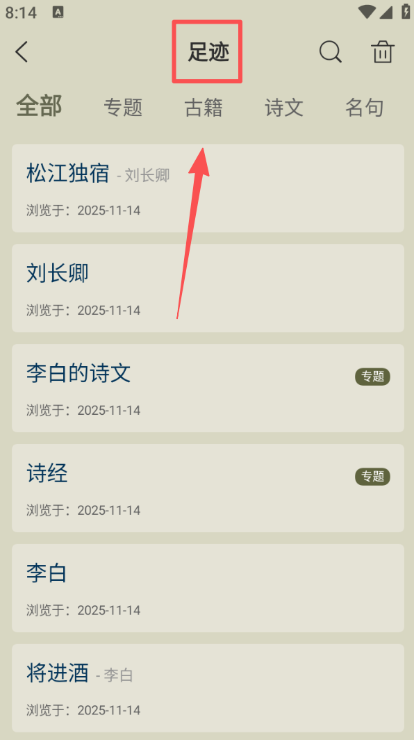 4、点击顶部 “足迹”,可查看过往浏览的诗文、古籍等记录,方便回顾。