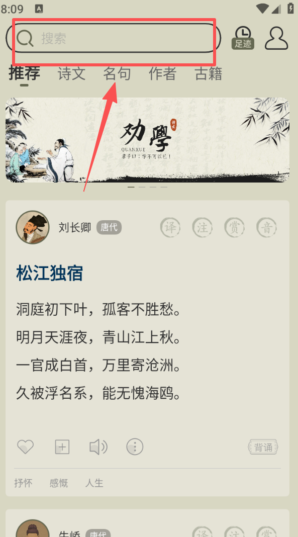 1、打开软件,在顶部搜索框输入内容,可查找诗文、名句、作者或古籍。