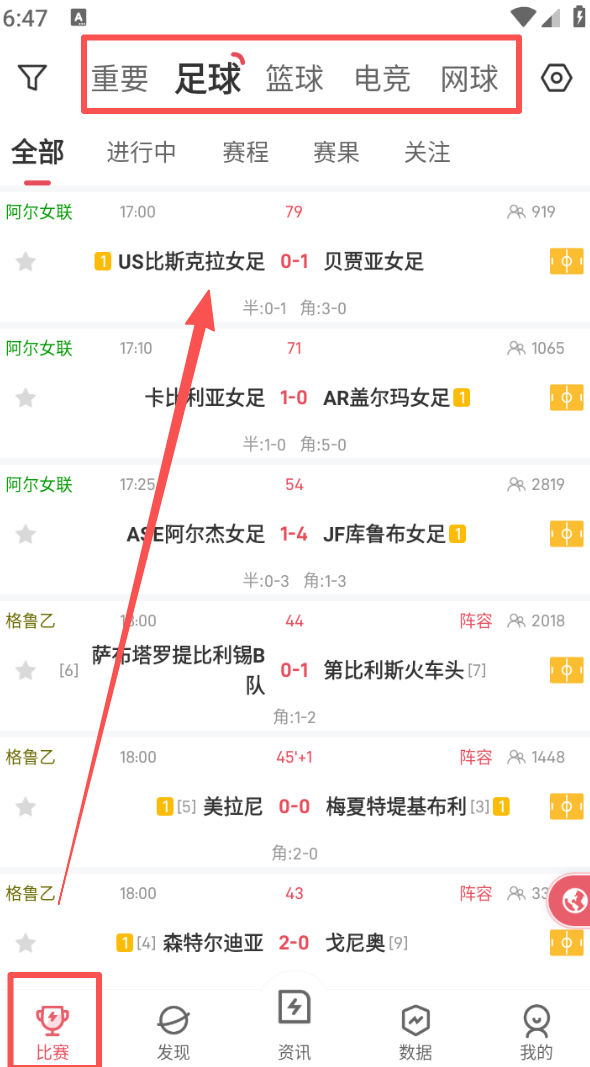 1、进入比赛页面,通过顶部 “足球”“篮球” 等分类标签,可筛选对应项目的赛事,查看实时比分信息。