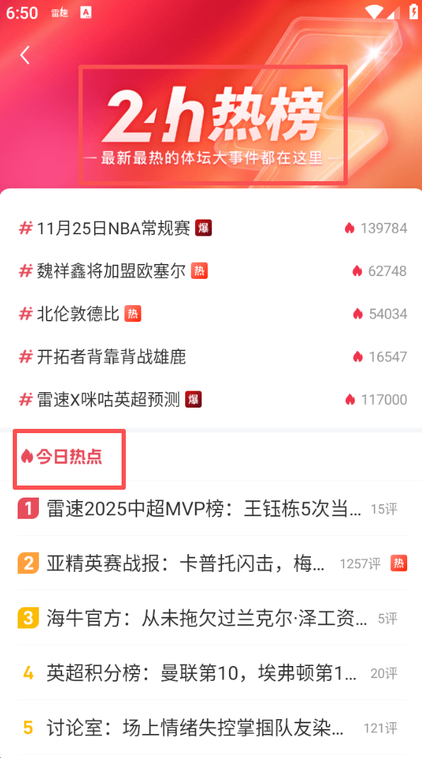 2、切换到发现页面,在 “2h 热榜”“今日热点” 板块,能浏览近期热门的体坛事件与赛事相关动态。