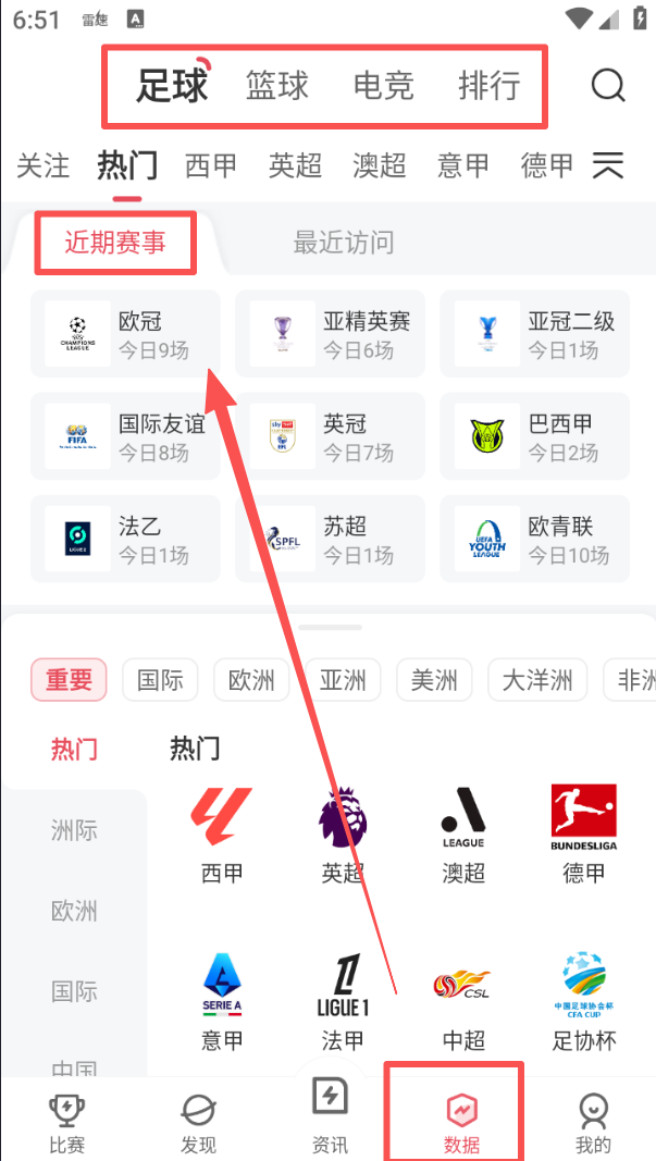 3、打开数据页面,选择 “近期赛事” 分类,可查看欧冠、亚精英赛等不同赛事的当日安排场次。