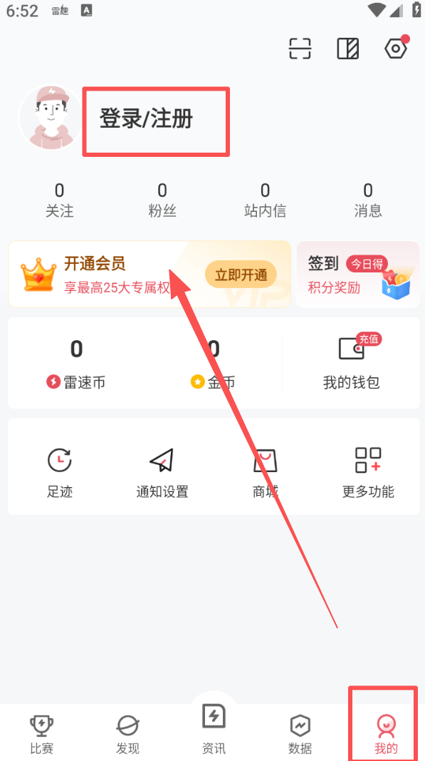 4、进入 “我的” 页面,点击 “登录 / 注册” 完成账号操作后,可管理关注列表、查看站内消息等内容。