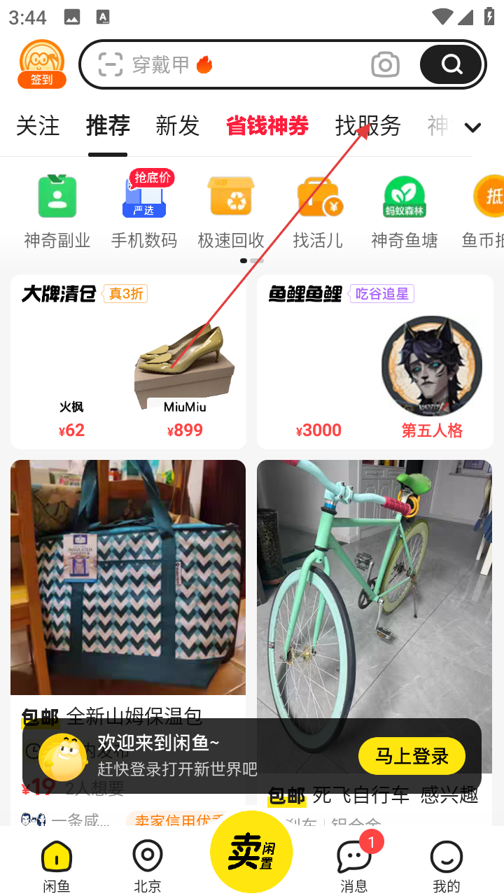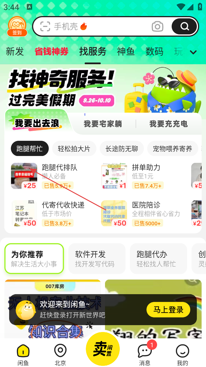 1、打开闲鱼APP,进入首页后,点击【找服务】选项,进入服务相关页面。