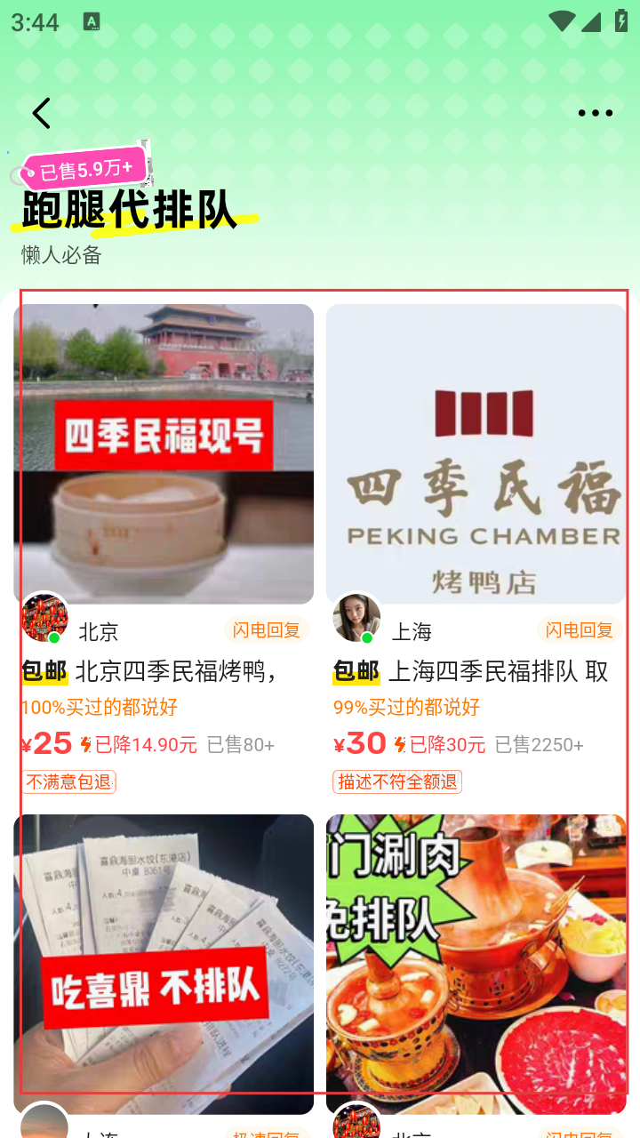 3、进入跑腿代排队服务页面,可查看如【北京-四季民福烤鸭】等代排队商品。