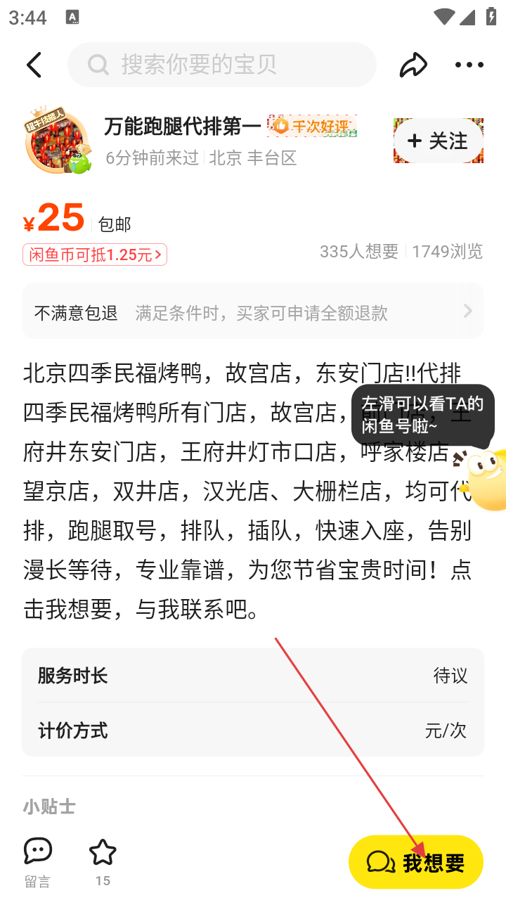 4、选中心仪的代排队商品后,点击商品详情页右下角【我想要】按钮,联系卖家。