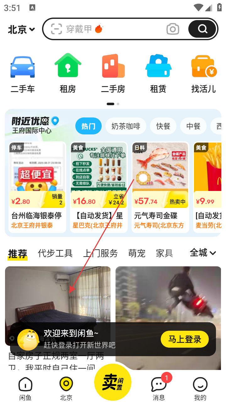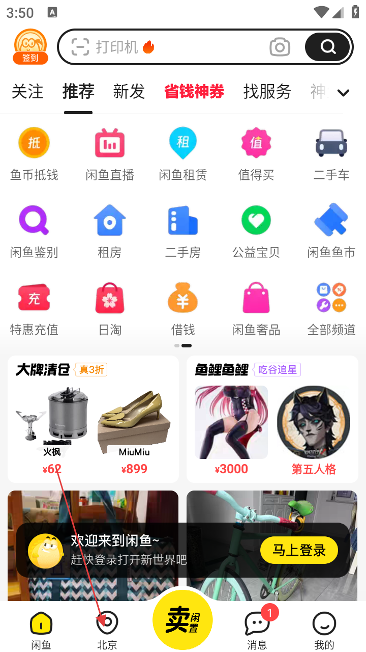 1、打开闲鱼APP,进入首页后,点击底部【北京】选项,可切换城市查看当地相关内容。