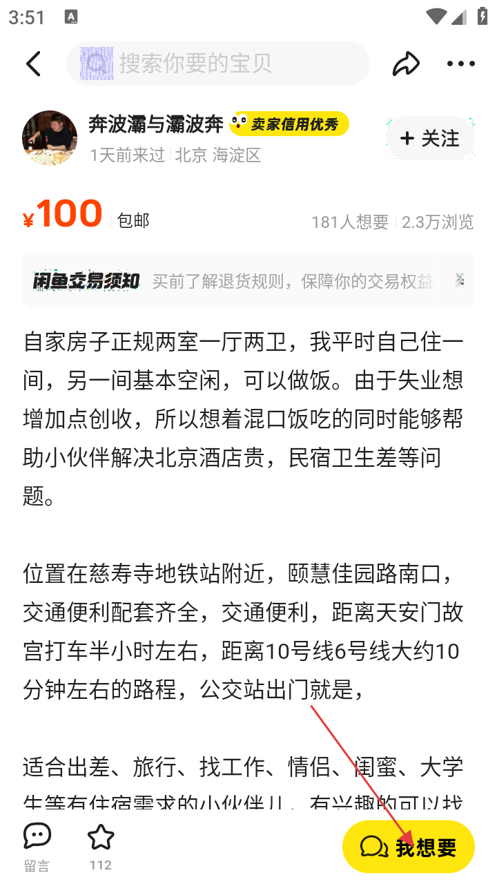 3、看到心仪的房源等商品后,点击商品详情页右下角【我想要】按钮,可进一步沟通。