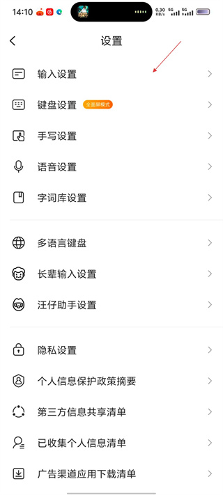 3、进入设置界面后,找到【输入设置】选项,点击进入可对输入相关功能进行个性化设置。
