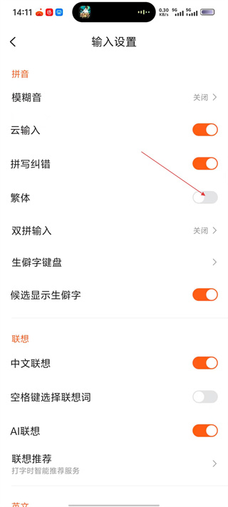 4、在【输入设置】中,可对【繁体】等功能的开关进行调整,优化输入体验。