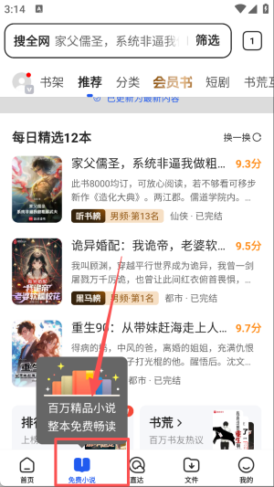 2、点击免费小说,查看推荐小说或进行全网搜索。
