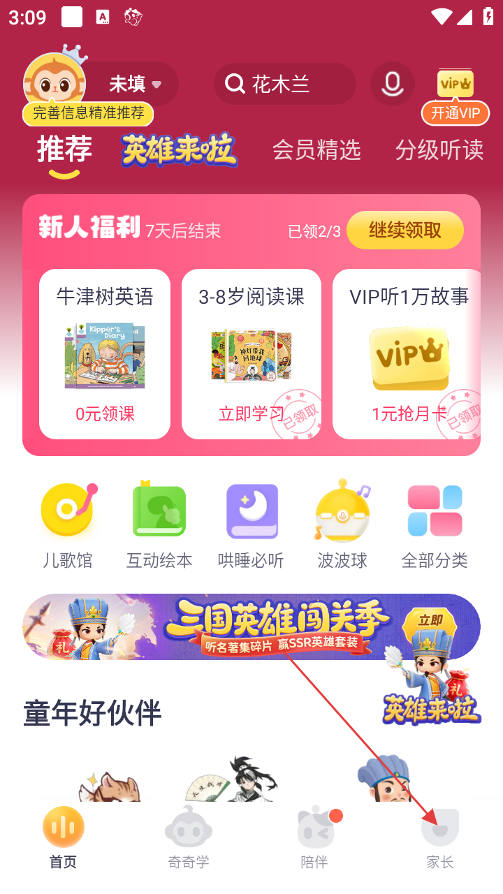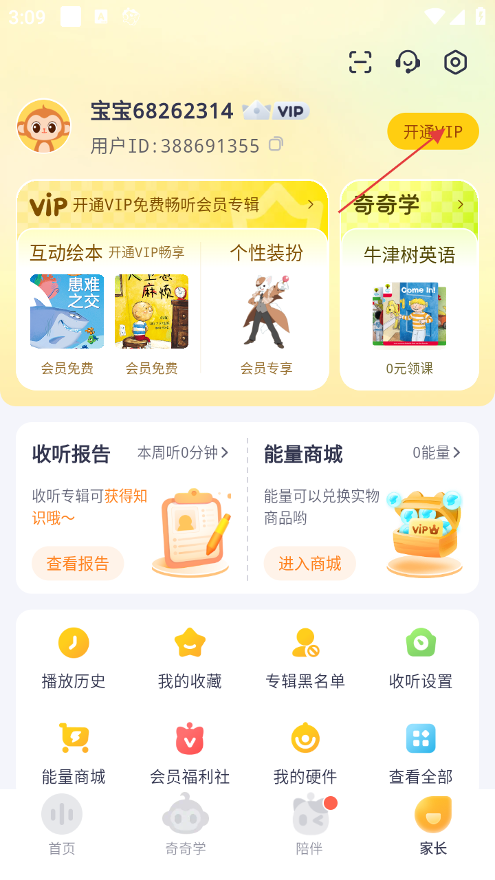 2、在家长页面,若想开通会员,点击【开通VIP】,进入会员中心。