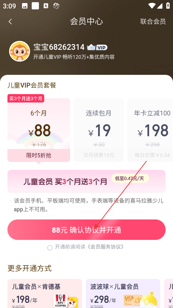 3、在会员中心,选择合适的儿童VIP会员套餐,如【买3个月送3个月】,点击对应开通按钮。